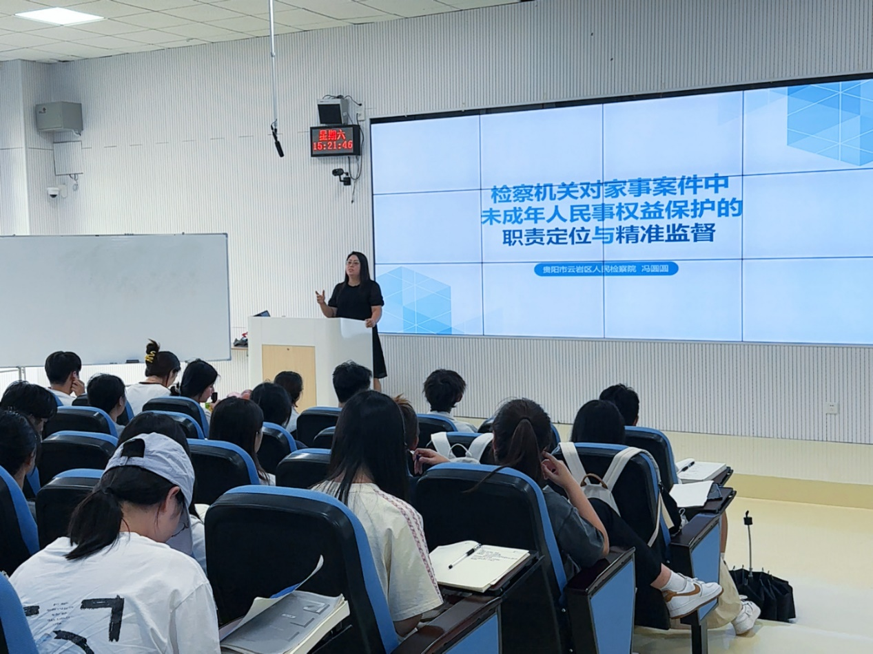 (法学院 王紫微 刘媛 图文报道)9月9日下午,开云登陆入口“三大论坛”之人文论坛、贵州省人民检察院“检察实务专家进校园”系列课程第二讲在乐学楼成功举办。本次讲座特邀贵阳市云岩区人民检察院检委会专职委员、一级检察官冯圆圆,以“检察机关对家事案件中未成年人民事权益保护的职责定位与精准监督”为主题进行授课,法学院副院长宋昭澜主持讲座,百余名师生到场聆听、交流。